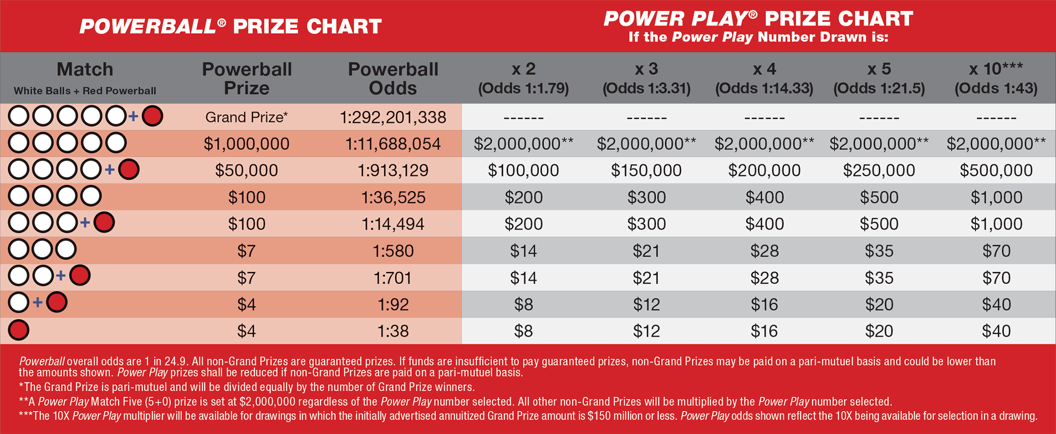 The Powerball jackpot grows until it is won. Players select five numbers from 1 to 69; and one Powerball number from 1 to 26. Players can multiply non-jackpot prizes by 2, 3, 4, 5 or 10 times with the Power Play® option for an additional $1 per play. NOTE: The Match 5 + Power Play prize is always $2 million. The 10X multiplier is only in play when the advertised jackpot is $150 million or less. Players can play their Powerball numbers again in the Double Play drawing for an additional $1 per play. The Double Play drawing is held after every Powerball drawing on Monday, Wednesday and Saturday. Double Play is available for purchase in 13 jurisdictions. Powerball jackpot winners may choose to receive their prize as an annuity, paid in 30 graduated payments over 29 years, or a lump sum payment. Both advertised prize options are prior to federal and jurisdictional taxes. The overall odds of winning a prize are 1 in 24.9. The odds of winning the jackpot are 1 in 292.2 million.